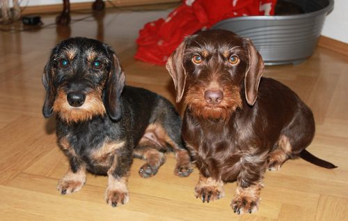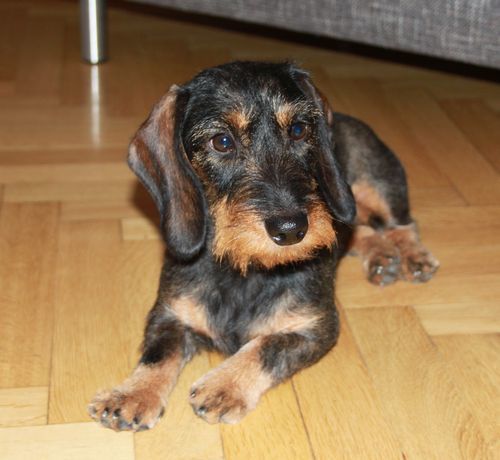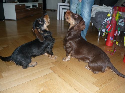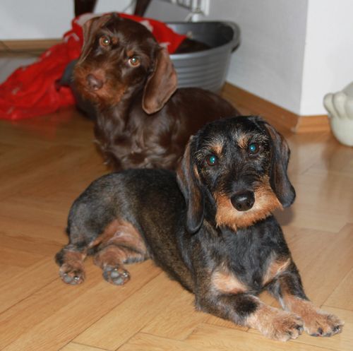 Exe ist ganz in der Nähe bei Ines Strupat-Frieg geblieben. Sie wächst mit einem Rauhhaarteckelrüden namens Aiko vom neunten Weinberg auf. Dadurch können wir ihre Entwicklung gut verfolgen. Sie entwickelt sich zu einer sehr aufgeweckten und quirligen Hündin, die ihrer Mutter Umbra in Sachen "springen und aktiv sein" in nichts nachsteht.